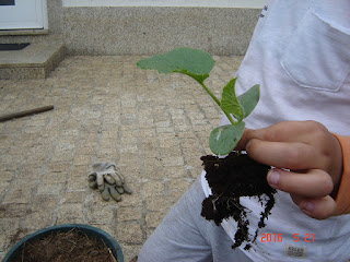 Arranjei uns vasos e plantei algumas lá, depois coloco num sítio alto e soalheiro e espero ver as meloas penduradas.