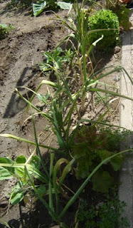 Nesta foto deixo-vos o estado actual do batatal e do cebolo. Lembram-se de vos ter falado do cebolo do Marco de Canaveses? Pois curiosamente foi o primeiro a deixar cair a rama. Isto não é nenhum mal, mas sim uma característica da raça.